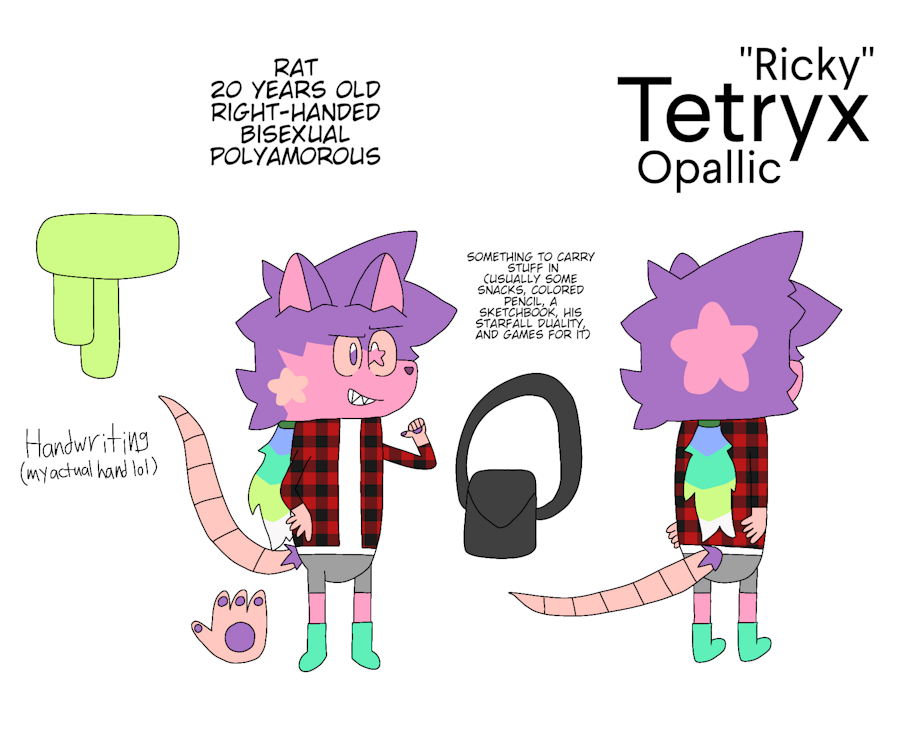 Has purple, pink and peach fur, but has no fur on his tail or the end of his limbs because he's a rat, he has star markings on his cheeks and the back of his head, he has purple paw pads, his feet are prehensile, and he has a purple right eye and a pink star-shaped left eye.