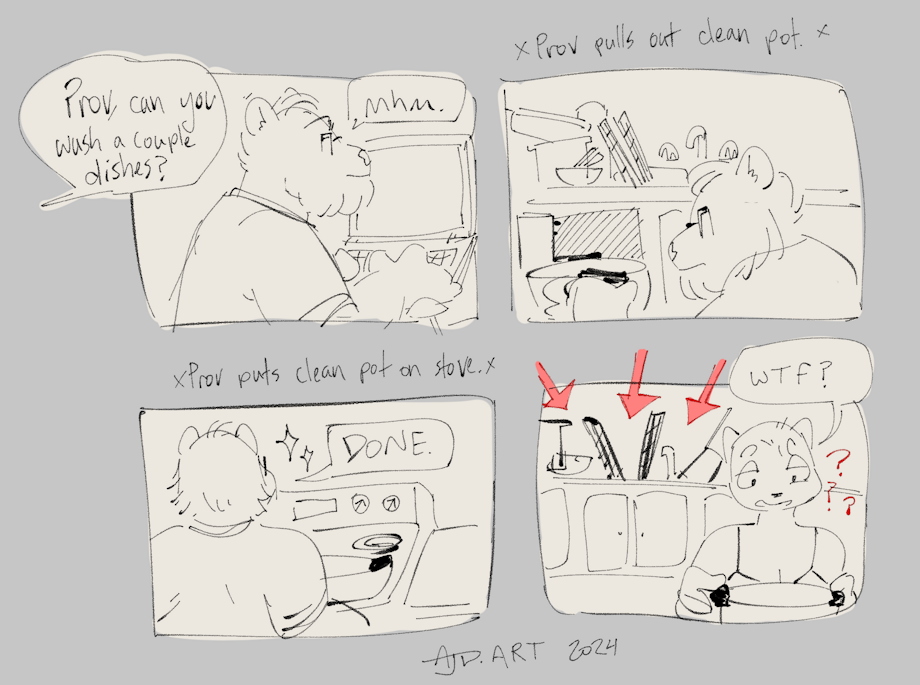 AJ ferret asking prov to wash some dishes. Prov half listening goes and pulls out a clean pan for the stove and leaves it for AJ. Not doing the dishes. AJ is now confused why there are even more pots out...