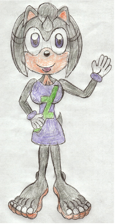 For my 15th anniversary at DA, I drew my Mobian OC gal Susan the Hedgehog wearing a purple dress with the DA logo while barefoot.
