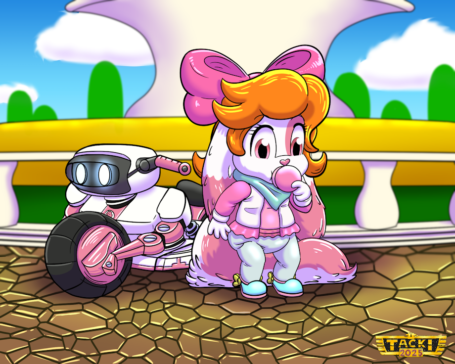 Kiffin’s been enjoying Mario Kart World and absolutely loves the different outfit choices available to the characters. Her current favorite is Baby Peach and her “Touring Outfit.” Here’s Kiffin dressed in the same in front of her pink ROB bike.