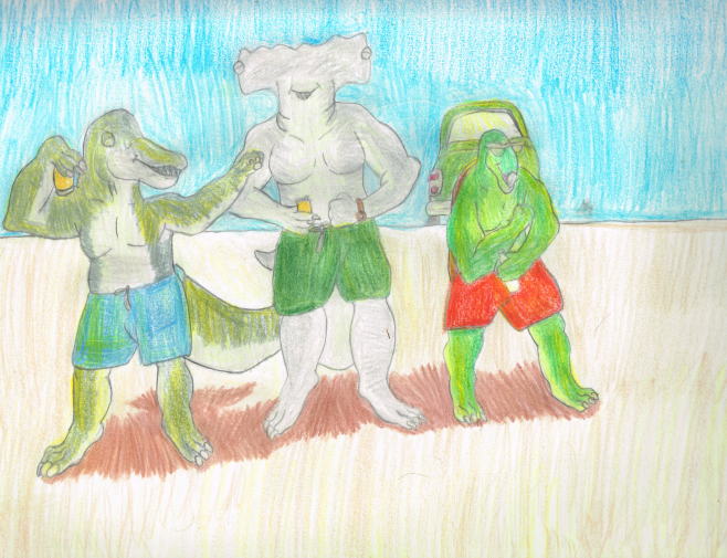 Another one done and just in time, too. I had wanted to draw a follow up to my Fishy Anthros drawing from a few years back, depicting the GLOW wrestler Hammerhead gal with her Bottlenose boyfriend on a beach but diverge instead to a drawing depicting said boyfriend goofing off with her brother (one of them, anyway) alongside a sea turtle fellow they know. The colors and anatomy are a bit rushed but sadly, there is no more time given I'd have to go with my family on a trip to Idaho so we can swelter at Silverwood together.