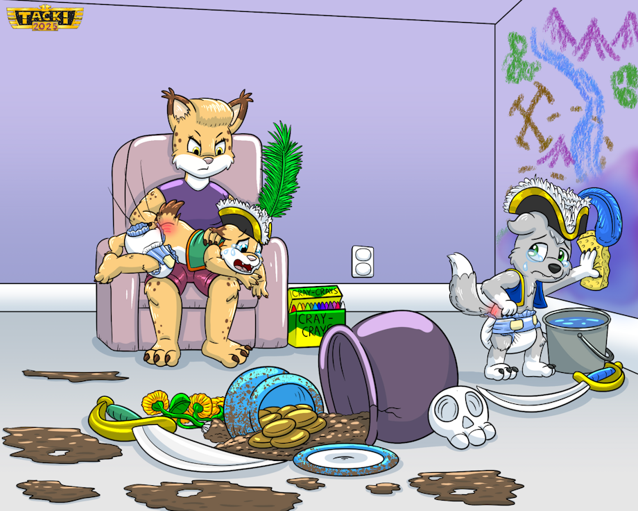 Caiden and Grayson may have gotten a little carried away with their pirate themed playdate at Grayson's house. They went all out with a mythical map on a 'cave wall' and buried treasure hidden deep in the ground (The cookie jar was placed inside the dug out vase and re-covered with soil). The Imperial Navy (Grayson's mother) was not pleased at all with the mess the two scallywags made and sentenced the little buccaneers to ten lashes and hard labor for their crimes.