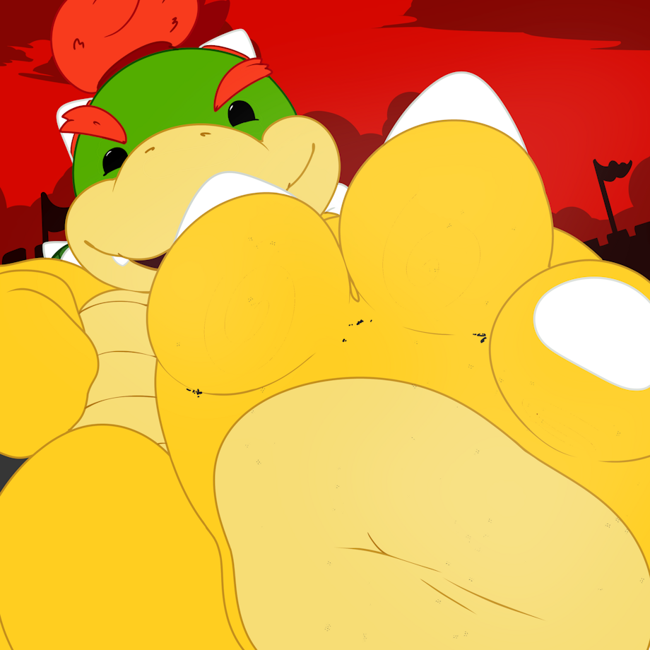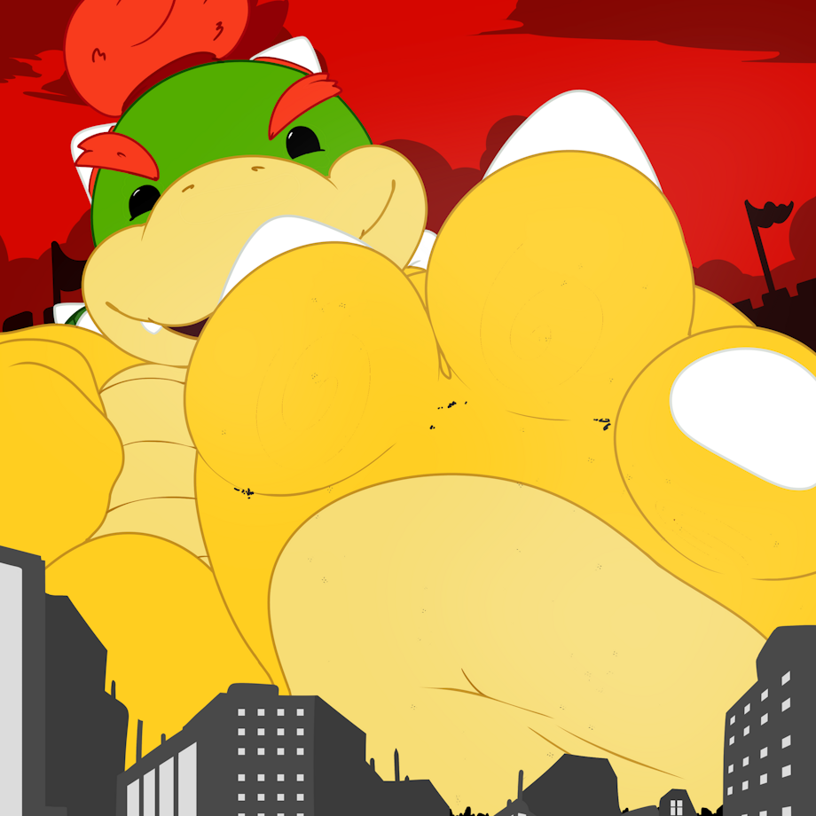 What I really love about this is that you can see the castle in the background. So in a way, its telling a bit of a story as if Bower's Keep flew into this general direction of the city and Bowser said Jr could go outside and play. Jr, being the very excitable and hot brat he is, goes about out the castle into the city. The significantly small city that he notices. He'd squeal in impish delight as he toes about trampling buildings with his massive bulbous feet against other cities 'miles' away (merely a few steps for him), bits of gunk between the lad's toes trickling and hitting whole acres as he makes his way to an area where he can see the most 'ants' below (just barely). Then he'd smugly say how he's their king and how he can tell them whatever he wants, in which case he says to these insects that he decrees to get squished! And there he goes, lifting his massive pudgy foot over even more of the city as the useless citizens run amock, as he's getting ready to start an entire rampage for his amusement. Just like the other places his papa let him play in. He's so smug and cocky with that impish smile. He's always so unbearably cute. Probably terrorizing them with the smell of his feet too from even this distance. They have no chance against the titanic kiddo's playtime of terror! This is lovely man! I looove your pictures, especially with this cutie. I love you can even see the toe swirls in the kid's chunky toes! Already got bits of smudges against his foot! Beautiful!
