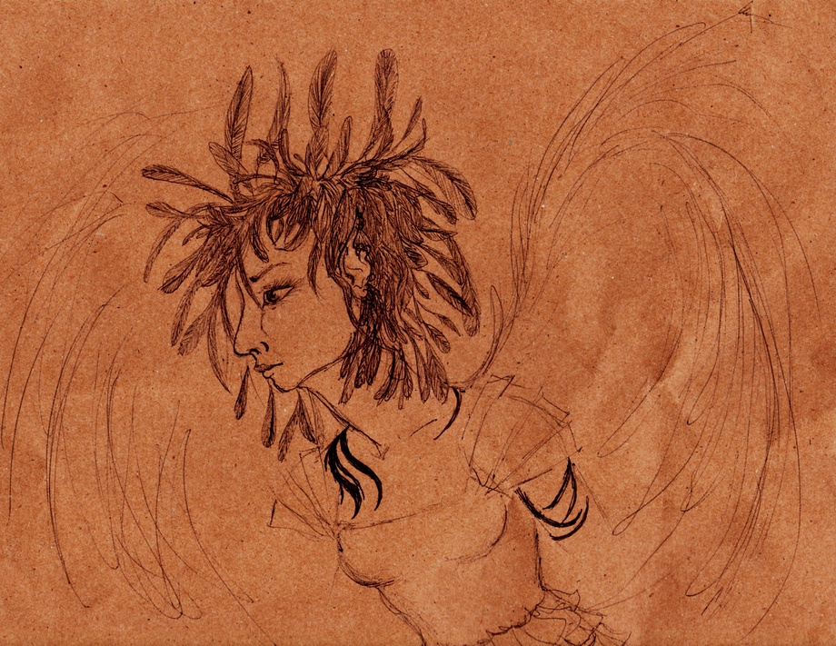 Another drawing from work. I wanted to focus on the facial features and hair. I tried to make the hair look more like feathers ( I have to admit, it was inspired by Howl's Moving Castle). I also made the nose larger, with a more downward slope to kinda mimic a bird's beak.