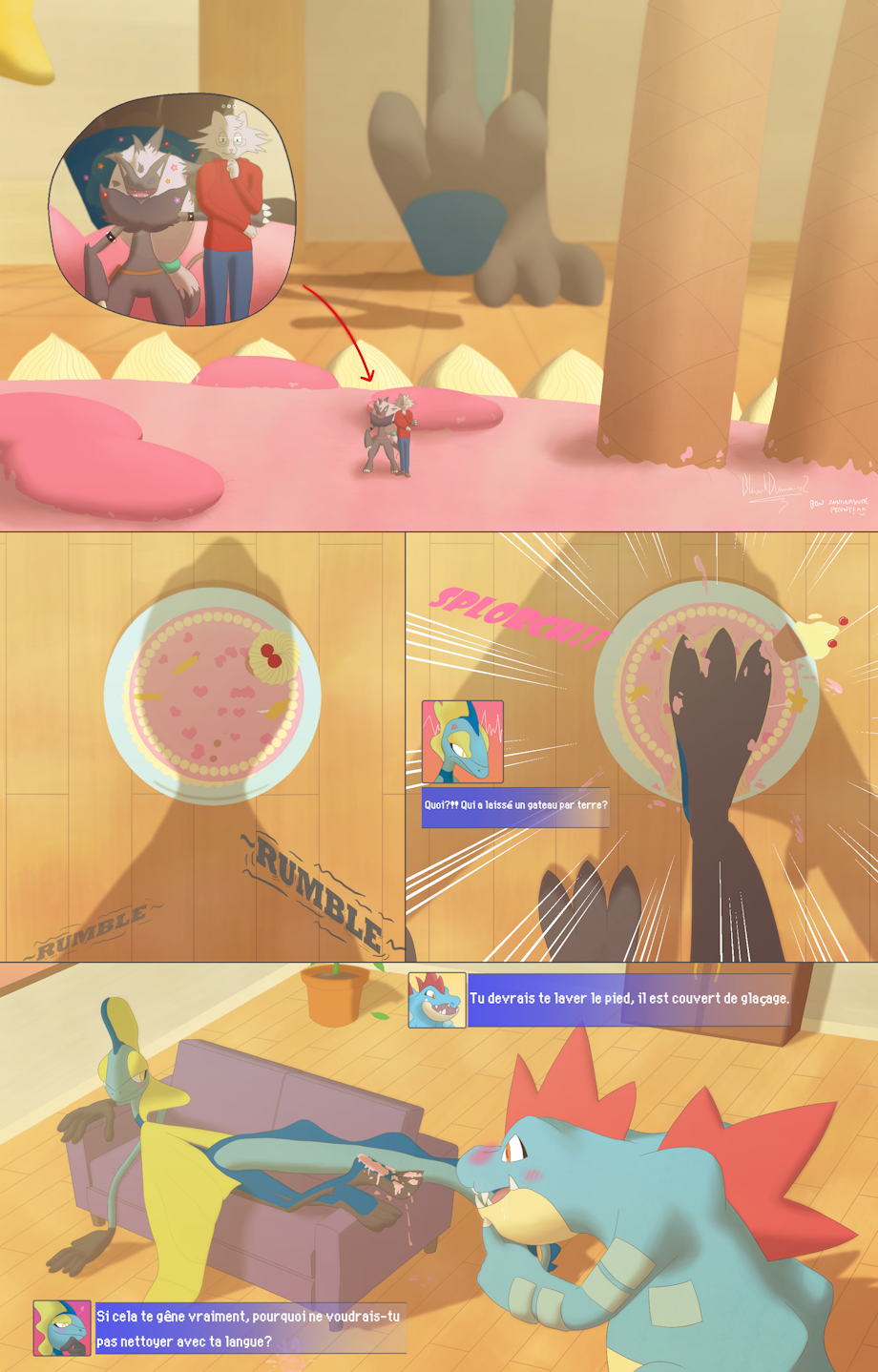 It had taken months and a lot of cash but at last, Kerberos had managed to prepare the definitive birthday party for his friend Pruny. The plan was rather simple if one considers a state of the art shrink ray a common household commodity: First Kerberos would cover Pruny’s eyes with a piece of cloth in order to hide the big surprise; then he would shrink both himself and Pruny down to 1mm in size whilst standing above a conveniently placed birthday cake; and finally he would tell Pruny to remove the piece of cloth, effectively having transported his friend to a sugary wonderland without him knowing that they are still in Kerberos’ dining room. However, it seems that in his eagerness to give the best birthday surprise imaginable to his friend, Kerberos didn’t take into account many factors, such as for example, his roommate being present for the “party” after getting out of work early, or the cake being placed on the floor directly in the path of the tired Inteleon. Still, the increasingly thundering booms caused by Inteleon’s steps as he made his way across the house looking for his roommate didn’t dampen the beaming zoroark’s mood, clearly satisfied with himself. In contrast, Pruny remained rather intrigued by how familiar their current environment looked, not buying at all Kerberos’ story about a secret realm where everything is made out of candy. However, he was also too focused to notice Inteleon’s presence until it was too late! Before any of them could react, their whole world was shrouded in darkness. The sky was suddenly replaced by a navy blue and black landscape. For a split second, both nanos were treated to the entire expanse of Inteleon’s sole in full detail before it quickly rushed downwards and crashed upon the frosted and sweet land both of them were standing on. For Kerberos and Pruny, a simple step from Inteleon was a cataclysmic event that left them pressed under his mind-bogglingly big sole whilst also completely obliterating the birthday cake. However, in the normal world, that step was met by a soft *SQUELCH* which in turn caught the attention of Inteleon, who hadn’t been looking at the ground. -“What?! Who left a cake on the ground?” exclaimed the water type before arriving at the only logical conclusion: -“That idiot… Kerberos! Where are you hiding! Come out and clean up your mess”. To say that Inteleon was irritated would be an understatement. His paws were covered in frosting, the floor was a mess, and he had no time to clean up since his date would arrive at any time. As such, Inteleon opted to leave the cleaning for later and instead went for a quick rest at the sofa while waiting for his Feraligatr boyfriend to arrive.