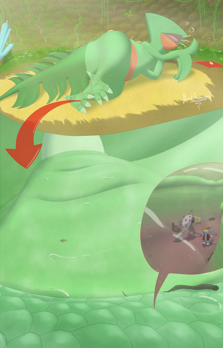 Meanwhile, far above the lost explorers, a mind-bogglingly huge sceptile from the nano’s perspective, the vice-guildmaster, rose from his slumber ready to enjoy his free day to its fullest. So far he had allowed himself to wake up way later than what he’s used to. He would have remained sleeping for a while longer had it not been for an odd momentaneous itch somewhere on his foot that interrupted his sleep. Still, the sceptile paid no mind to such an insignificant sensation and instead prepared himself for a day full of entertainment in the privacy of his chamber.