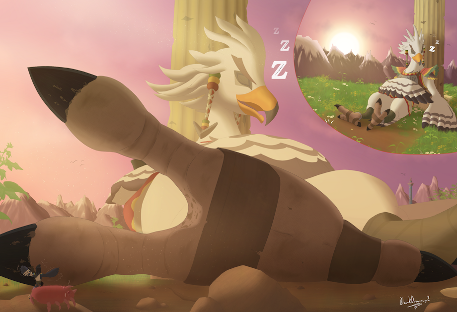 Ah… nothing beats the feeling of relaxing under the warm golden rays of a golden afternoon after a good day of work protecting the village. Teba sure knows that and makes sure to enjoy these fleeting moments of peace as much as possible. Still, it seems that this time not everyone was having as much of a good day as Teba. Mere inches away from the resting rito, but at the same time miles away, a mite-sized Harth struggled to get the attention from his comrade. Unfortunately, his broken wing made it all the more difficult to succeed in rousing the sleeping titan from his peaceful nap.