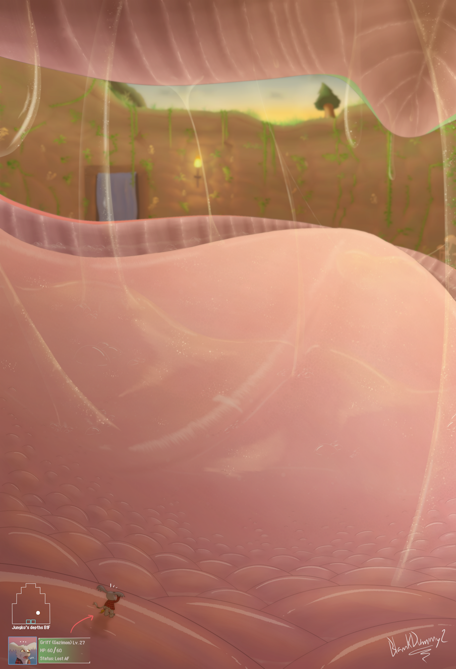 Just as it seemed that things couldn’t get any worse for the speck-sized explorers stranded inside the vice-guildmaster’s mouth, they became separated after Sceptile started getting a full taste of the product of his passion. The two motes of dust were no match for the country-sized tongue. Swimming in lakes of saliva became even harder once Sceptile’s jaws closed down, drowning the entire chamber in darknes, and the tongue started moving around in chaotic patterns, making sure to get all the taste and leave no trace of spunk in the mouth. Of course, amidst all that chaos, Griff got lost after Kerberos was swept away by a particularly strong current of saliva. By mere chance, Griff was able to perch himself on top of a tastebud, thus escaping the sticky sea of drool that threatened to sweep him towards the back of the tongue, just as it had happened to Kerberos. Griff was finally able to catch his breath, or as much as the muggy atmosphere inside Sceptile’s maw allowed it. What’s more, he managed to get to solid ground just in time to witness the mouth opening once again, letting the golden rays of the setting sun light the wet and sticky cavern. From his position on top of a tastebud, Griff was treated to a full view of Sceptile’s room, partially eclipsed by huge tendrils of saliva, and blurry due to the extreme size difference between the gazimon and his host. However, this peaceful moment would not last, as an ominous thundering grumble coming from the throat spelled trouble for the tiny explorer. Not even a couple of seconds later, a powerful and deafening storm was unleashed upon the poor gazimon, threatening to send him flying away into the unknown. After what felt like hours, the chaos subsided once again, leaving a dazed and lost Griff behind, now in an even muggier environment. At least he could entertain himself guessing what the vice-guildmaster had for lunch today.