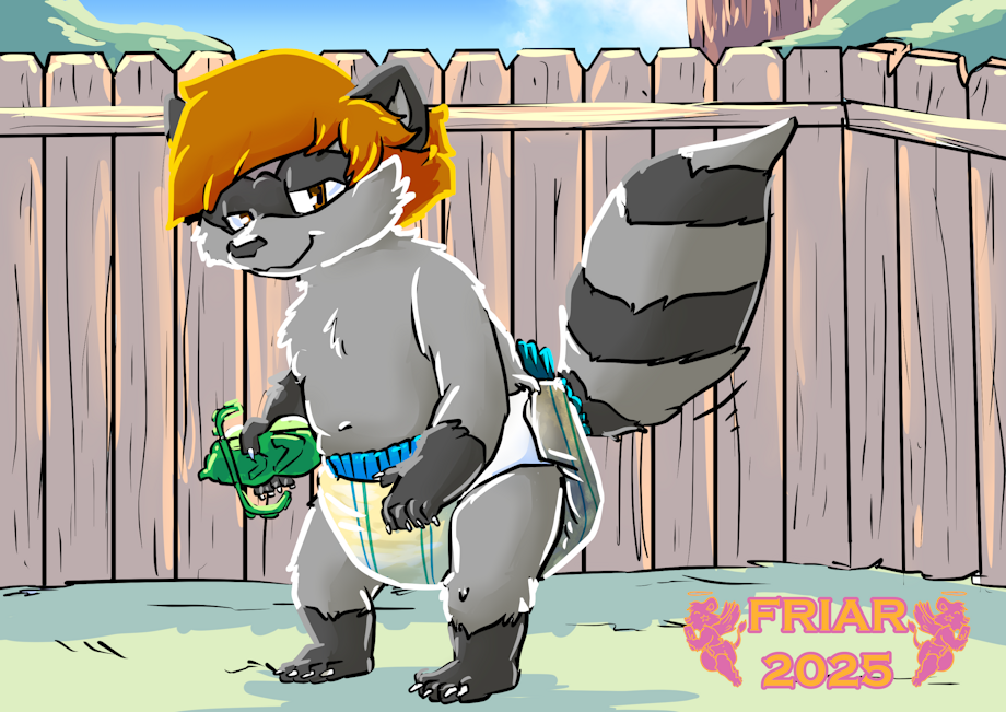 Illustration of Friar the wet and messy diapered regressed lion cub on all fours on the changing table, looking at the viewer.