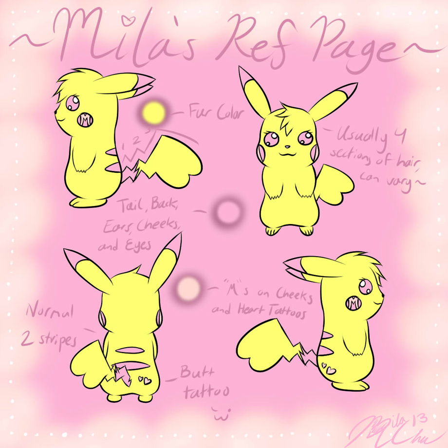 Milachu is mostly a basic-looking Pikachu. Her design is simply: yellow, pink, and bright-pink. As a female Pikachu, she has a female tail. She usually has four sections of hair. She also has a heart tattoo on her rump~