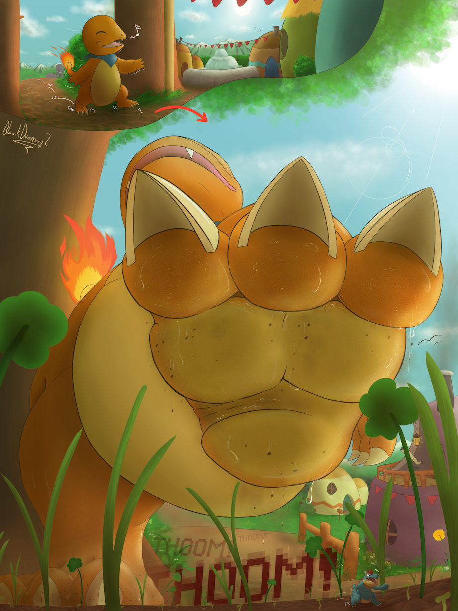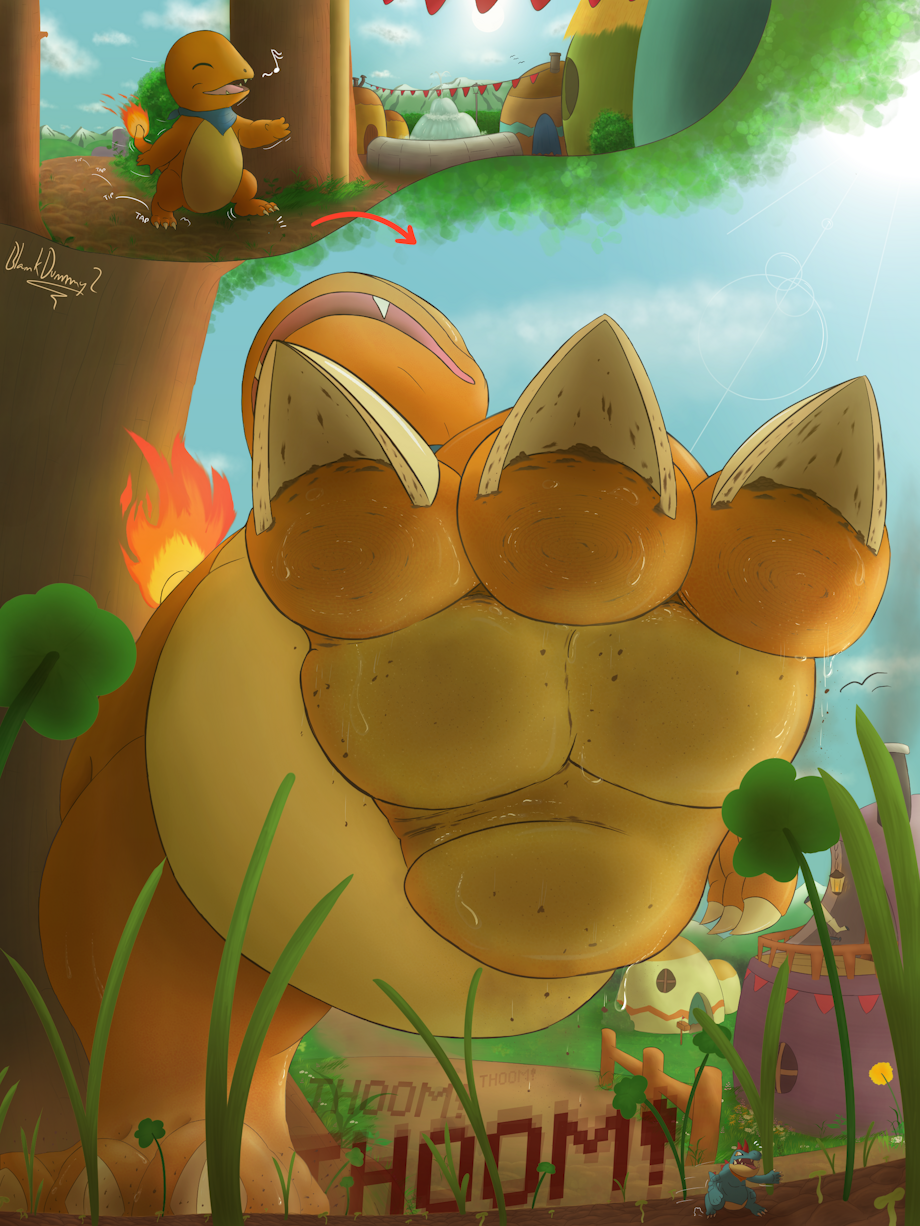 As the imposing structure drew ever nearer, Feraligatr finally made a shocking discovery. On a closer look, the approaching mountain resembled a charmander, a huge one in fact, one that he remembered from one of the rookie teams back in the guild. Feraligatr struggled with this fact, since as far as he could remember, the last time he had seen Charmander, he was barely 2 feet tall, not almost a mile. Something wasn’t adding up in the water type’s mind. The only logical conclusion his mind could reach was that somewhere in the dungeon, something had caused him to shrink to a fraction of an inch! Feraligatr cursed himself for not paying more attention to his surroundings. Still, his train of thought was suddenly interrupted when the area around him was cloaked in darkness. One quick look upwards confirmed his worst fears. Whilst he was distracted, Charmander had kept on walking and was now upon him. The sky was soon replaced by the grimy and sweaty underside of Charmander’s foot as he readied his next step, happily unaware of the fate of any germ or shrunken explorer unfortunate enough to cross paths with him. In a fit of panic, Feraligatr started to run, not wanting to end up smashed under the cream-colored sole. However, it was too little too late for the water type, as soon everything started to go darker and darker as the foot approached. The last thing he noticed before everything went dark was the musky scent of Charmander’s paws after a full day of hanging around the village enjoying his free day.