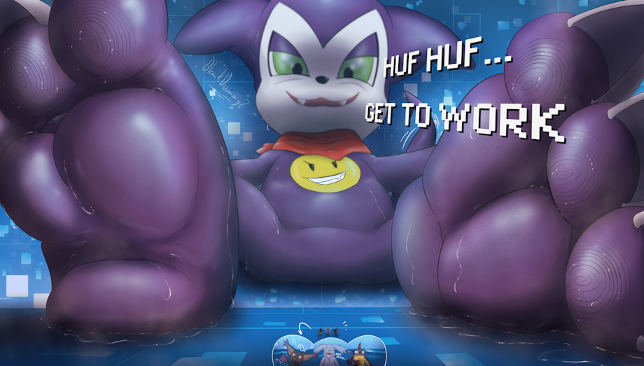 From the tiny group’s perspective their entire horizon was soon replaced by two towering purple walls. The two gargantuan paws were positively steaming and soon the air around them was completely overtaken by Impmon’s aggressive musk. In addition, Impmon’s perspiration started pooling around the base of both paws, creating salty lakes comparatively so large that the tiny pranksters would be able to swim in them. The speck’s attention would be occasionally caught by the twitching of Impmon’s toes, wafting some additional scent in their direction as well as dislodging grime boulders which fell to the ground like meteors. All of this happened whilst they were under the distant yet watchful eyes of Impmon, who looked at his shrunken comrades with expectation.