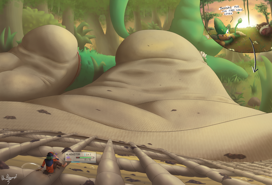 Meanwhile, Alabastor was forced to reckon with being a speck lost on the threads of his own used sock. He was so small that he had to be careful where he stood, otherwise he could fall down towards the expansive dusty toeprint of Simisage. To make matters worse, he had to deal with the combined stench of Simisage’s foot musk as well as his own, both powered up by the intense afternoon sun warming up Simisage’s paws. It actually made him regret skipping laundry so many times over the past week, eager to continue his lucky streak. It all seemed so distant now that he was back to square zero. Still, it was too soon to give up, he just had to find a way to escape the sock he was stranded on and reach his backpack all the way at the border of the meadow. Then he would be able to use Tyrunt’s pokeball to call his starter for help. It was just a matter of how many days it would take him to achieve that…