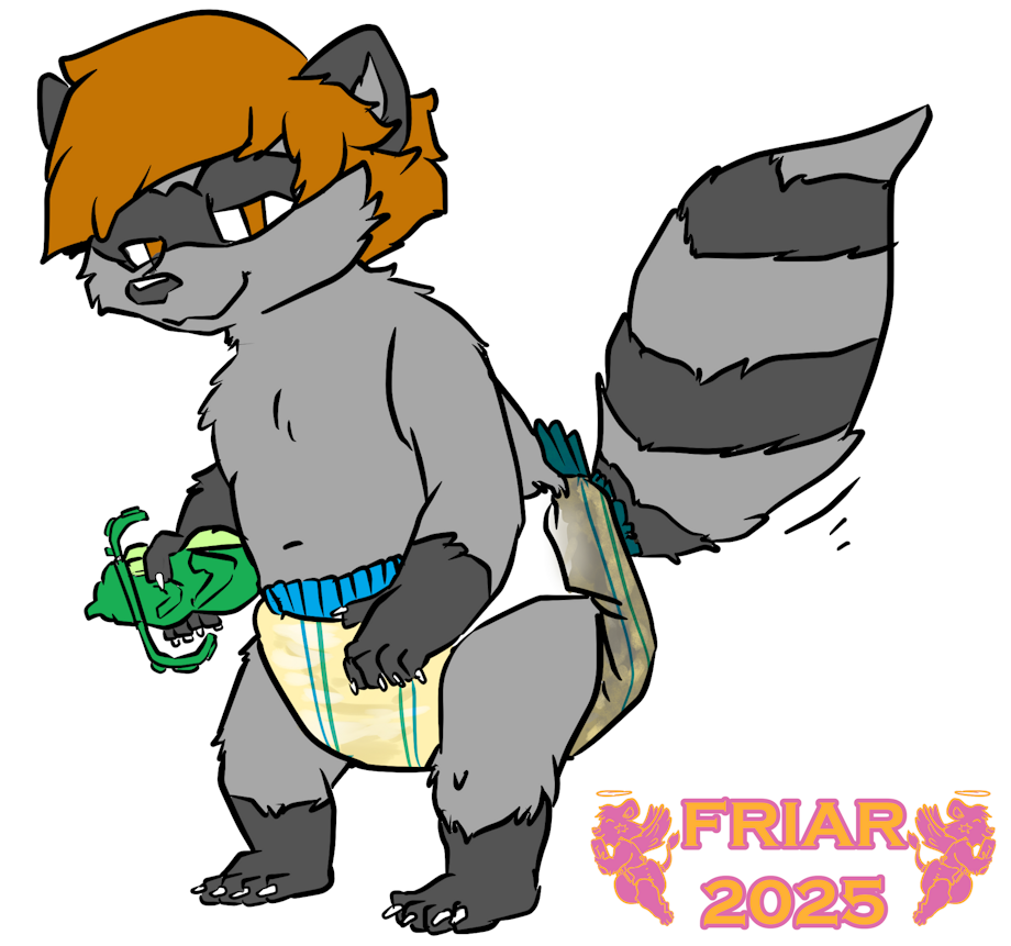 Illustration of Tylahn the wet and messy diapered raccoon carrying his sippie cup and raising his tail while standing in the backyard.