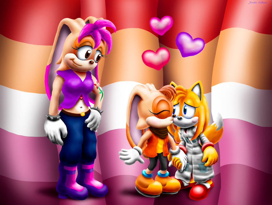 This drawing is based on a request by GGCPictures(requests are currently closed) who wanted Cream the Rabbit holding hands and kissing Zooey(from Sonic Boom) in a lab coat while her mother Vanilla watches with a smile. He also wanted them in his punk clothing designs.