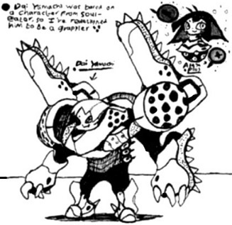 Dai Yamachi is a psychopathic human fused with a chainsaw (which works into some of his attacks), which gives him the nickname "the Saw King". His entry into the tournament is just a way for him to kill more people. A few years ago he fought and killed a leaf-insect/plant mutant named Katsuki (Tamoto's father), so he because Tamoto's hated foe.