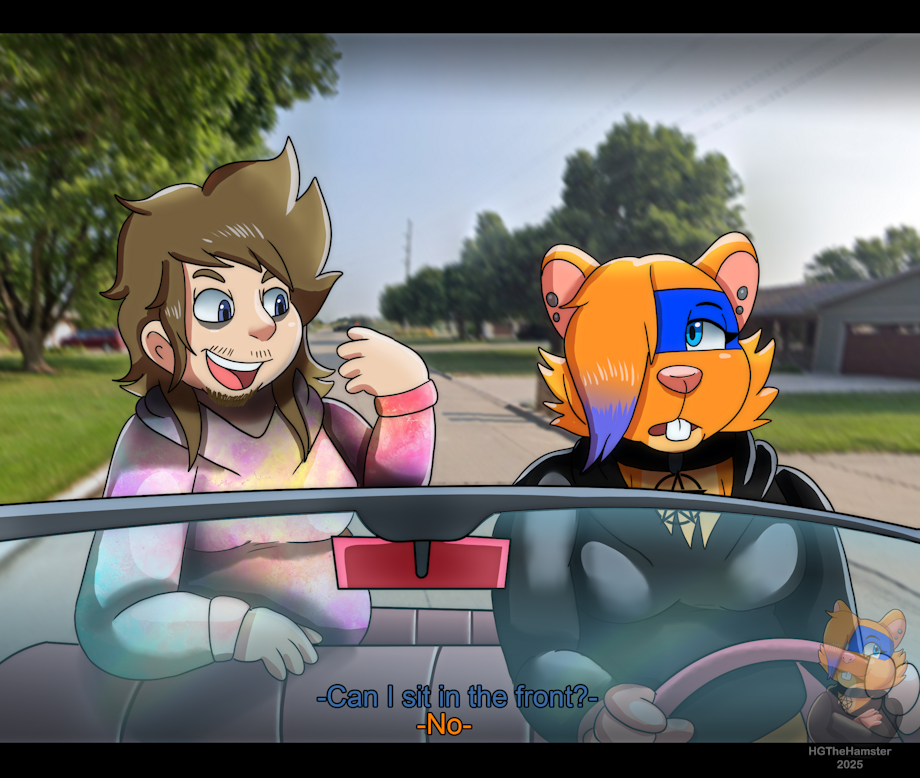 Recently I and a couple friends sat down and watched the Barbie movie. and of course in every movie we watch we like to make dumb AU's. So we made one that involved my fursona and a couple of my partner's OCs. Which spoiler alert for the movie, in our AU Cyrus took over my webcomic to make it his own. This scene is a redraw of the car scene where Ken sneaks into Barbies car.