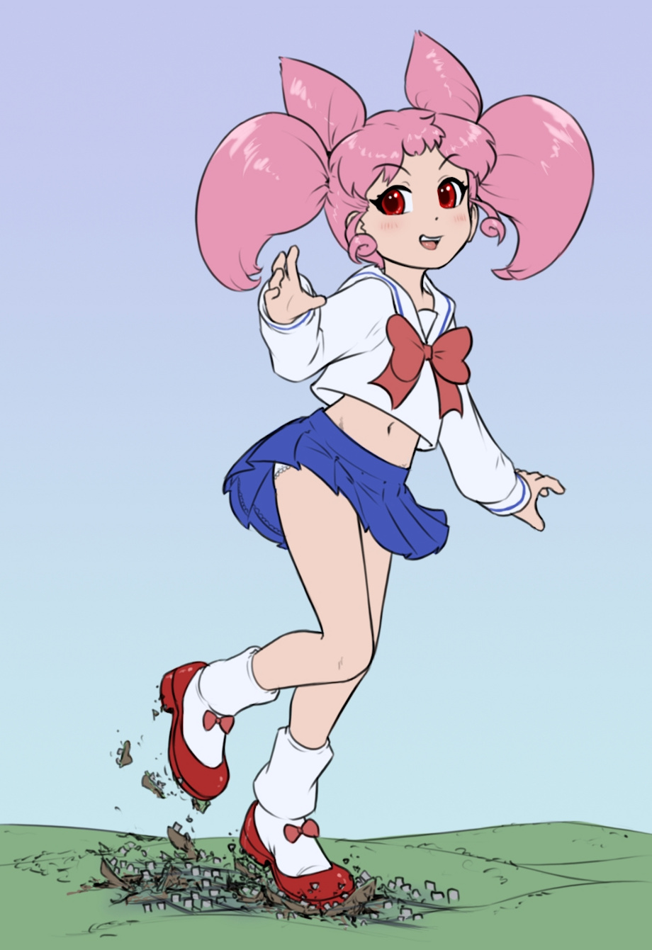 Nice Chibiusa! She's especially large this time, what impressive stomps! The ground being torn up underneath her cute shoes is rendered excellently, and she seems quite proud of her efforts! Good tummypeek, too. Destruction at this size is always fun to see, a good start!