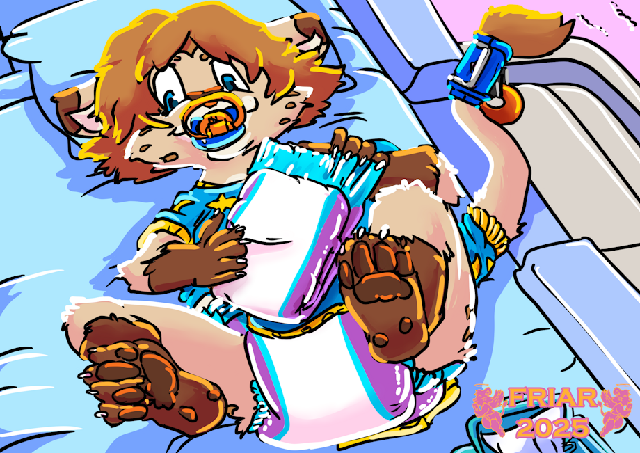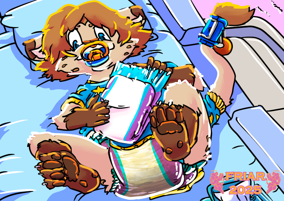Illustration of Toffee the wet and messy diapered lion holding a diaper while on the changing table in an unsnapped onesie with his feet in the air.