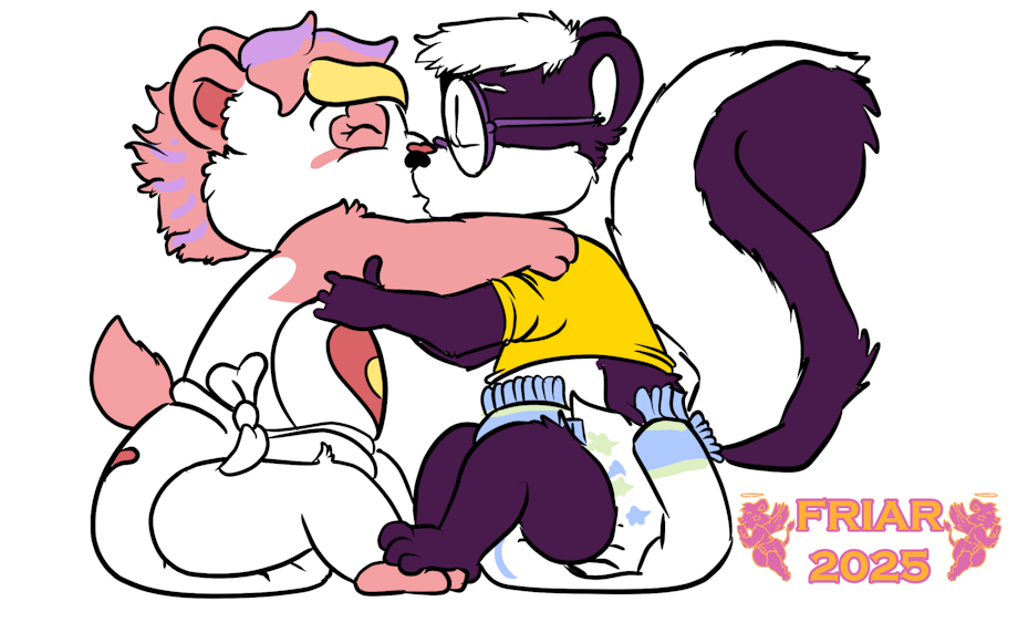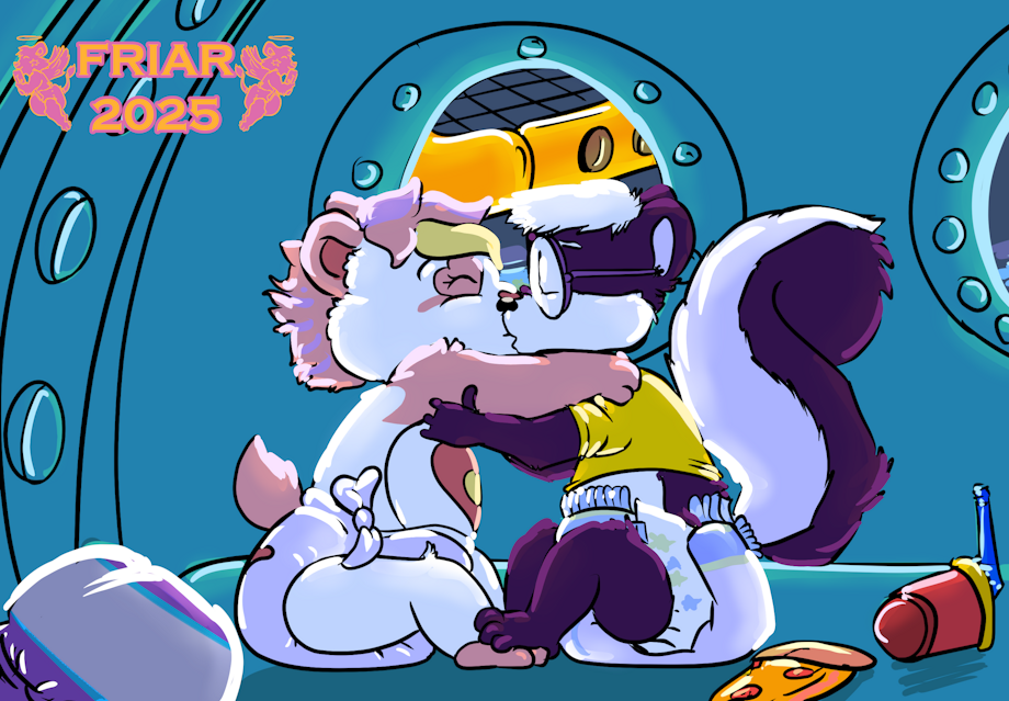 Illustrated commission of Token Heart Bear the diapered carebear tenderly kissing their girlfriend Score Chaser the diapered skunk in a pizza joint playground tunnel where there is a diaper, a discarded soda cup and a slice of pizza.