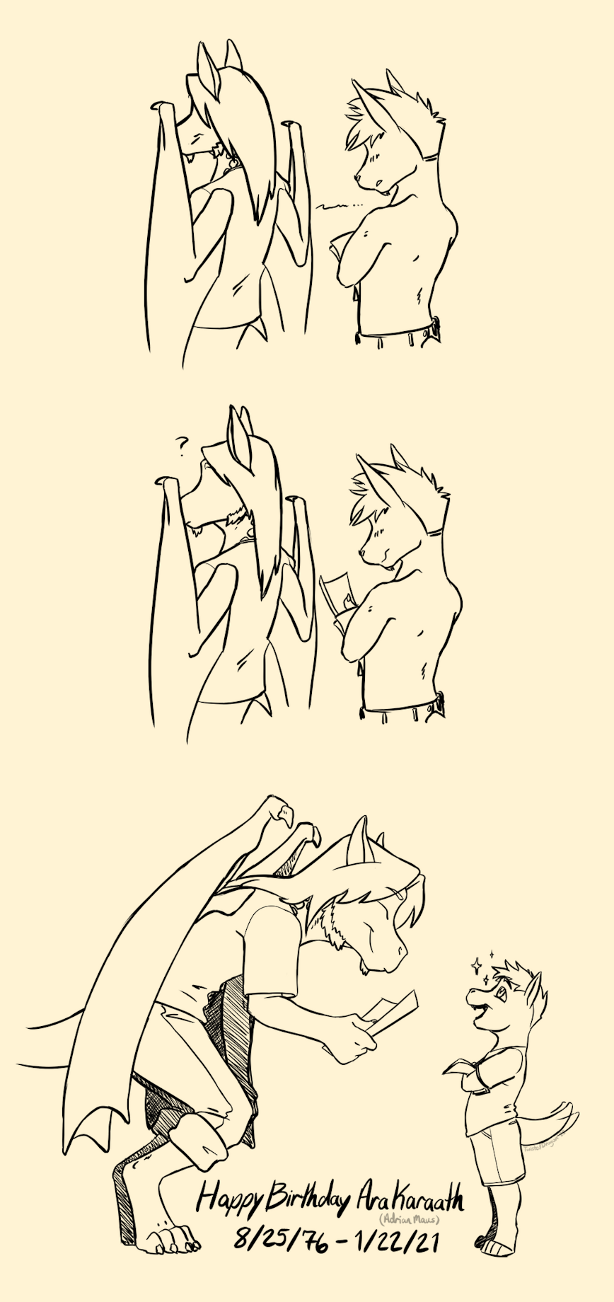 If it isn't obvious Ara was a big inspiration to me during the formative years of becoming a furry and learning how to draw furry art. I only reached out to him once. It took days of struggling to get up the courage to do so and although I can't recall exactly what was said anymore I do remember him being positive and even more friendly than I had hoped, encouraging me to draw more and draw better. I wanted to try to best capture the feeling I got with that reply :3