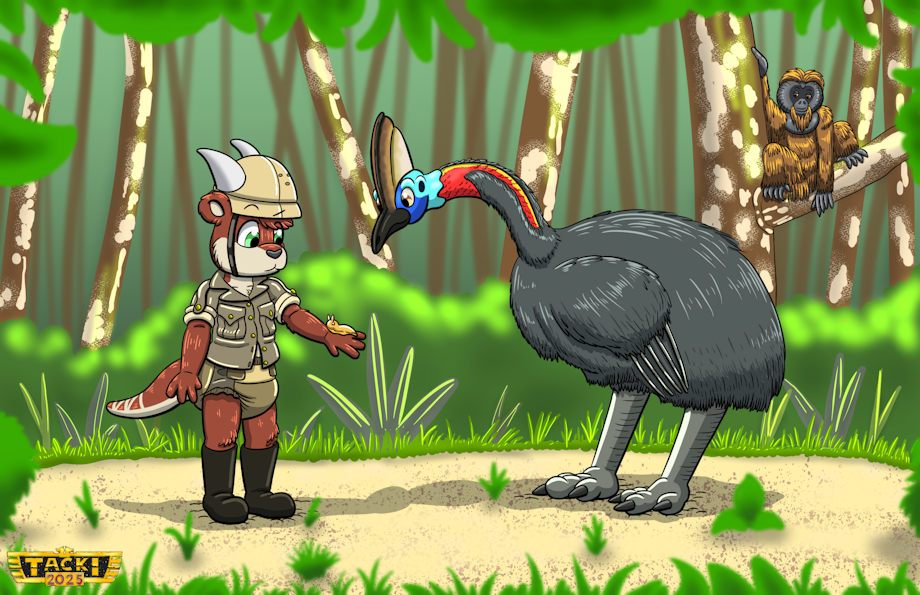 A commission for my dear friend JJ the Otter! He's showing a strange jungle slug to a new Cassowary friend while an orangutan looks on from the jungle trees. JJ is dressed in a safari outfit and hat, similar to Tommy Pickle's safari attire from the Rugrats Movie oh so long ago, including the khaki diaper!