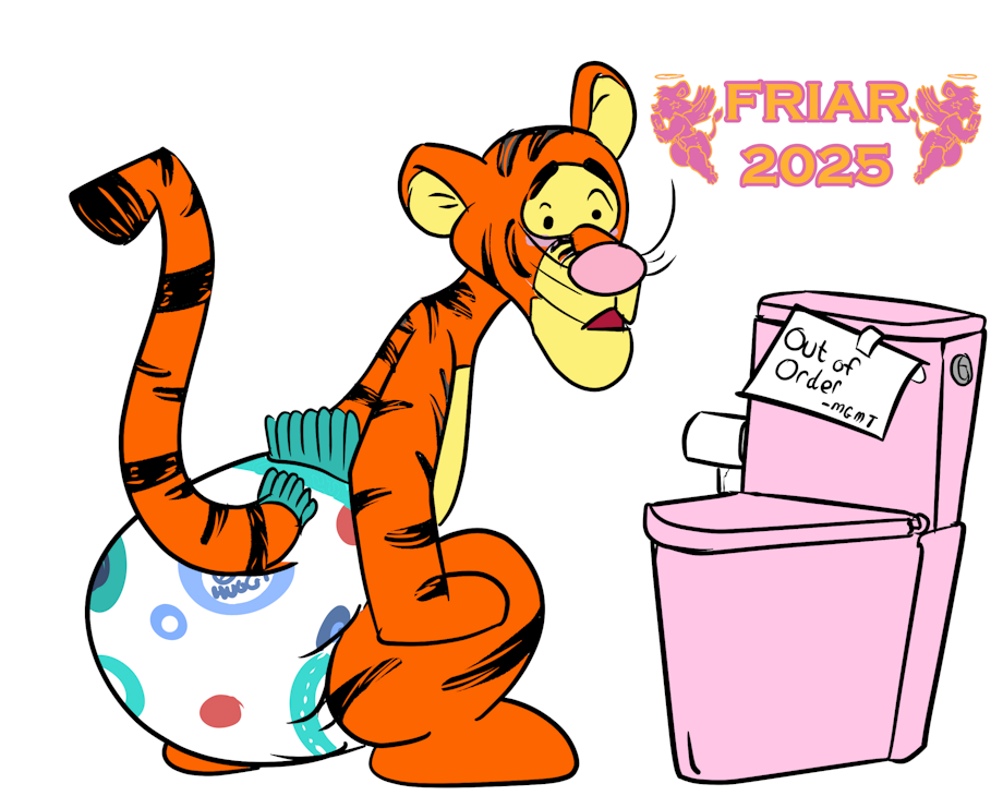 Illustrated commission of Tigger the wet and messy diapered tiger filling his diaper and leaking pee next to an out of order toilet.