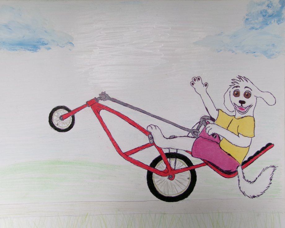 Jason Braxton has a unique modified bicycle modified to ride either as a bicycle or up on the rear wheel as a unicycle. A fellow dog friend of Jason, Calvin Wilson, works as a metal shop apprentice and knows how to weld. Jason had purchased an ordinary bicycle at a yard sale, then asked Calvin to modify it for him the way he wants it. Jason and Calvin are long time friends who on occasion do favors for each other, and Calvin was happy to do the favor for Jason. The petal crank and sprocket had to be relocated to the top of the frame where the original seat use to be to make it work. The handle bars had to be moved back with a steering link rod extending to the front. And a high back seat was fabricated to prevent Jason from sliding off and falling off behind the bike. A small front wheel was also installed with the front forks slightly lengthened to give the wheelie cycle that cool dragster look.