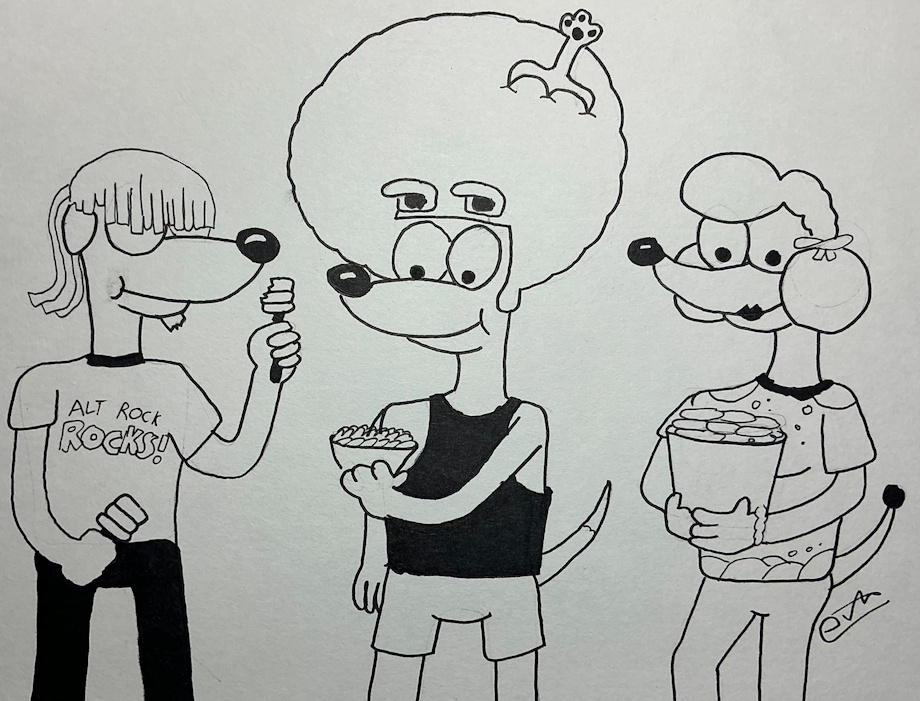 Icedog eats cheese curds, Fresh eats cookie dough on a stick, and Roxie eats a bucket of chocolate chip cookies.