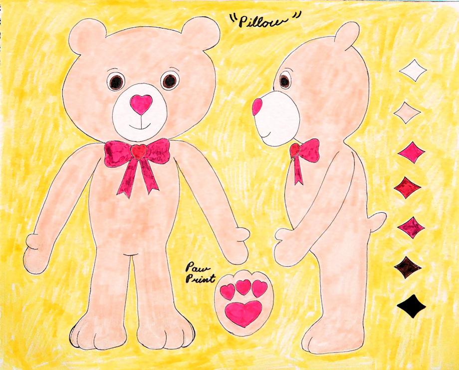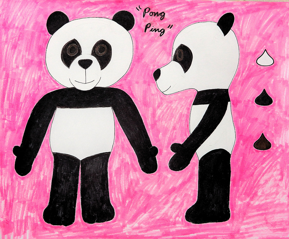 Both characters have chubby bodies and soft furry coats. Pillow's fur is light brown while Pong Ping's is the usual black-and-white panda colors. Pillow has a pink nose and paw prints, while Pong Ping has hardly any paw prints at all.