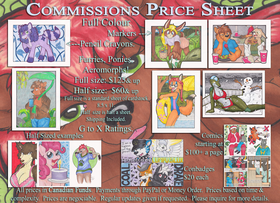 Currently, I am charging (starting at) $125CND for a full page commission, and $60CND for half sized. Full sized is what I usually post of late, and half size is more good for bust or upper torso pictures. I am also doing Conbadges for $20CND each and willing to do some comic page work as well on a TBD rate.