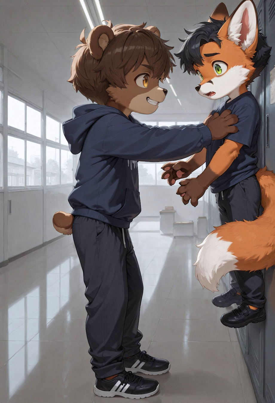 Levi left over Thomas alone, exposed to the dangerous which were hiding just around the corner. Out of nowhere, someone rammed at our little fox with great force, causing him hit the school lockers really hard. As Thomas looked who was that, he immediately recognised this nasty face...