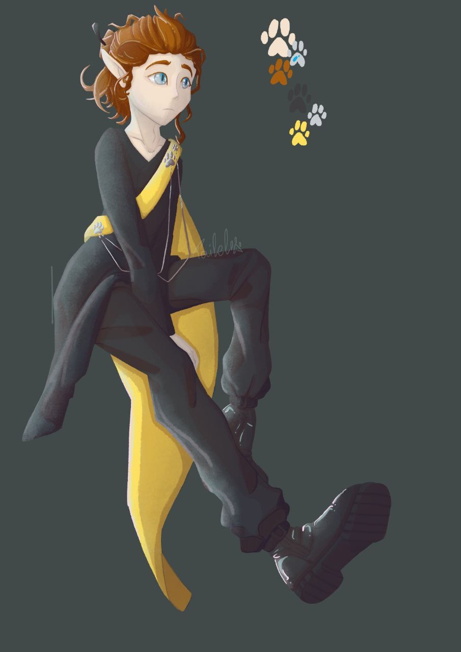 ✨ Tailel — mascot of the channels. This is one of his forms (he also has a furry form). An elf with auburn hair and light eyes, dressed in dark clothing with a bright yellow accent. He sits thoughtful, a little distant, yet filled with quiet inner strength.