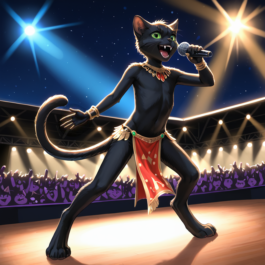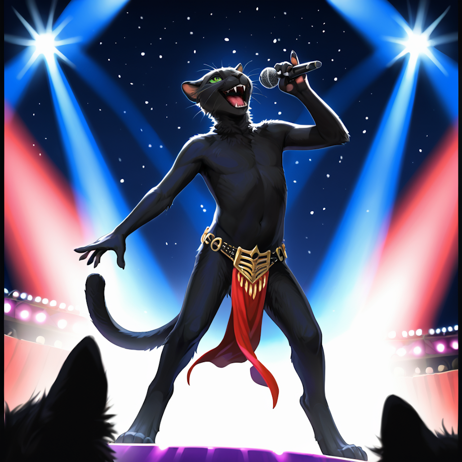 This young cat was discovered when he was young and became one of the most popular musicians before he was even half way through his teen years. He's a confident panther. While nudity isn't taboo, it is frowned upon in public, so this cat challenges that even though his agent forces him to wear at least something while performing.