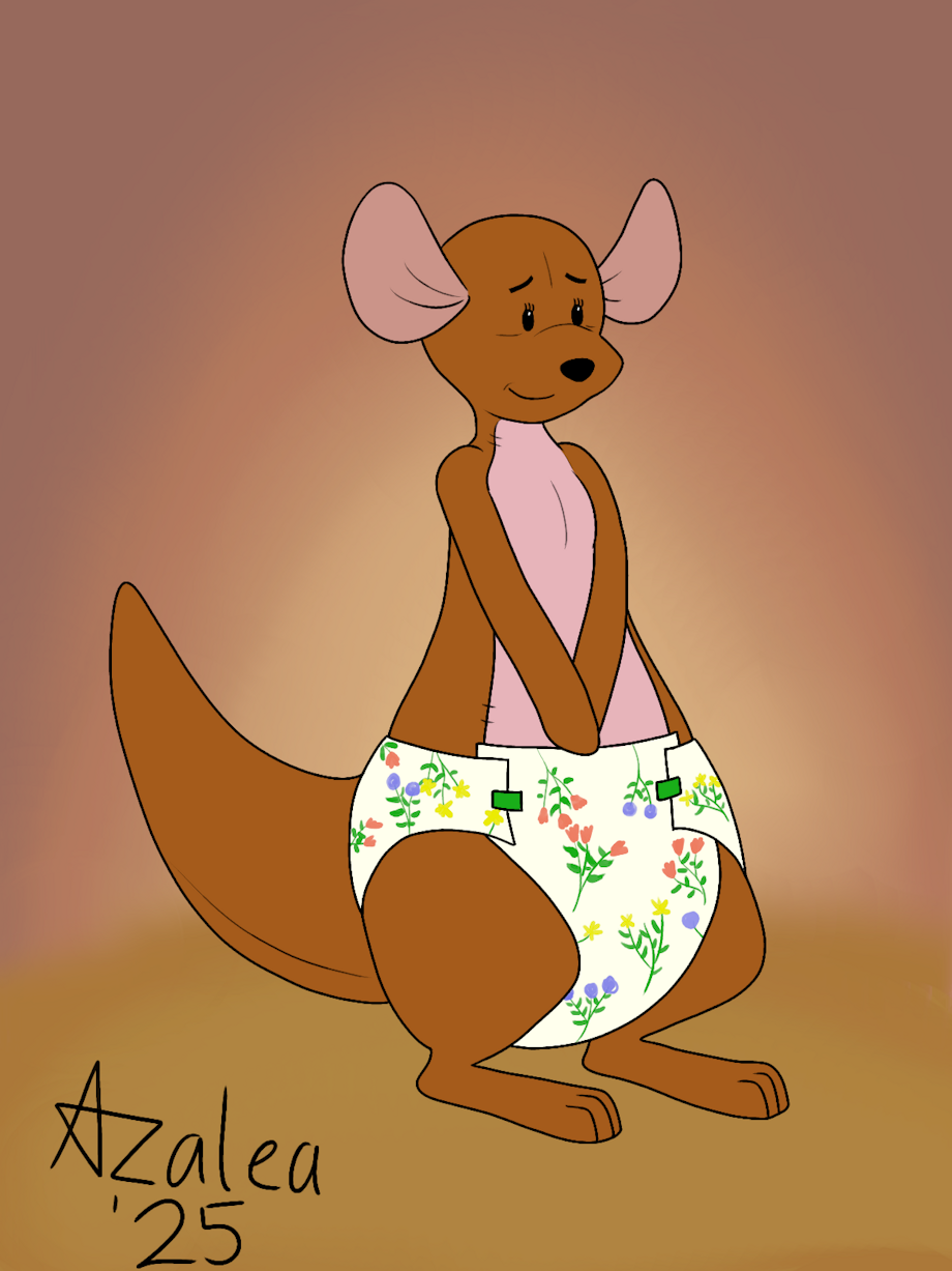 The next character, now randomly chosen by RNG instead of popularity, is Kanga from Winnie the Pooh. This was an interesting one to draw, figuring out the body shape for Kanga. Anyways, here she is in her home, wearing a cute floral diaper she got for herself.