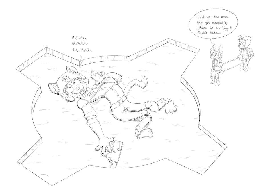 This was a little fun thing I drew up for Swift, who is quite fond of Lorepaw's Warhammer catboi. While I don't know the first thing about Warhammer 40k, I can guess that taking on a giant mech called a Titan with just a pistol is a bad choice. Lorepaw got stomped with enough force to leave a deep imprint in the ground, spreading him out and knocking him silly. Surely the medics, Swift and Ander, will get him to the med bay where they'll figure out some way to get him back on the battlefield.