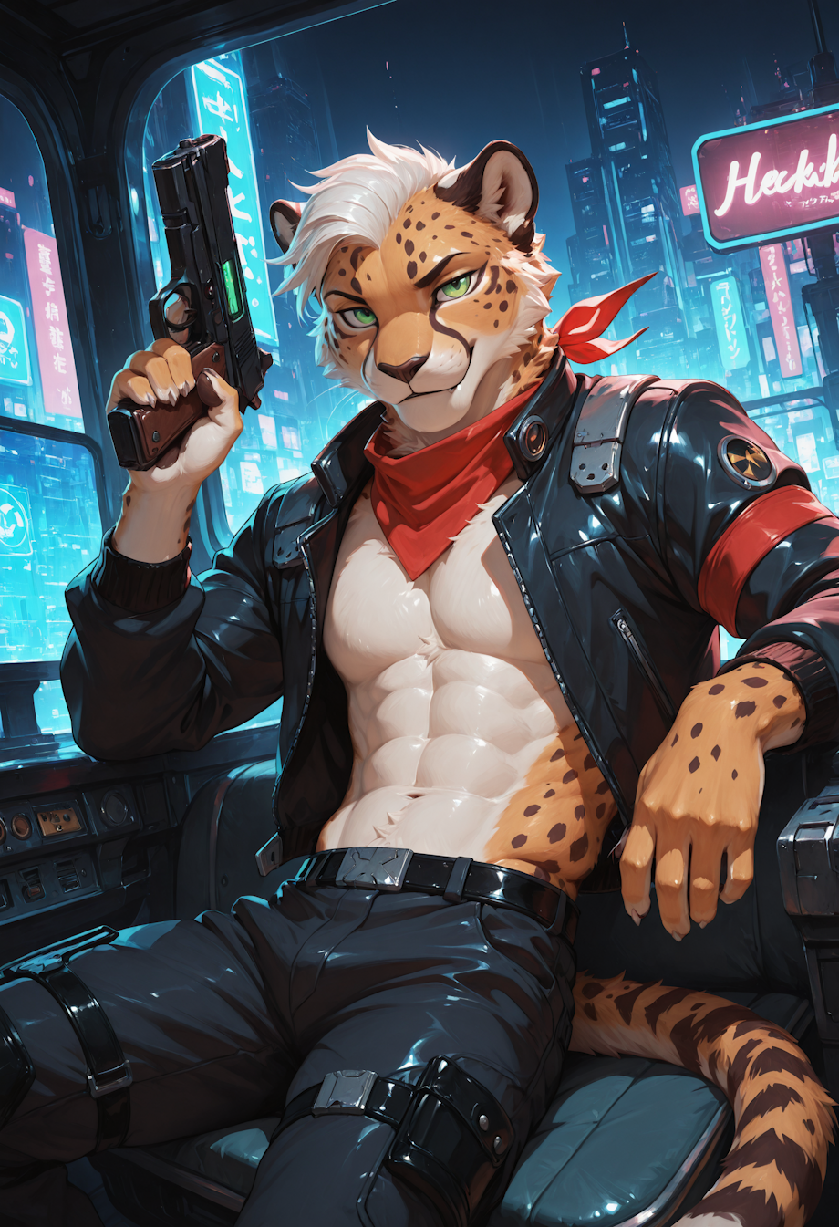mammal, solo, male, felid, anthro, clothing, clothed, hair, sitting, digital media (artwork), green eyes, feline, cheetah, fingers, detailed background, 5 fingers, (cyberpunk:1), pantherine, topwear, city, smile, fur, open topwear, bottomwear, open clothing, pants, abs, white hair, red bandana, Holding an object, holding weapon, Holding pistol, Neon lights, dark, night, (Glowing clothing:1) , looking at viewer, (Hacker deck on seat:1), Sci-fi
