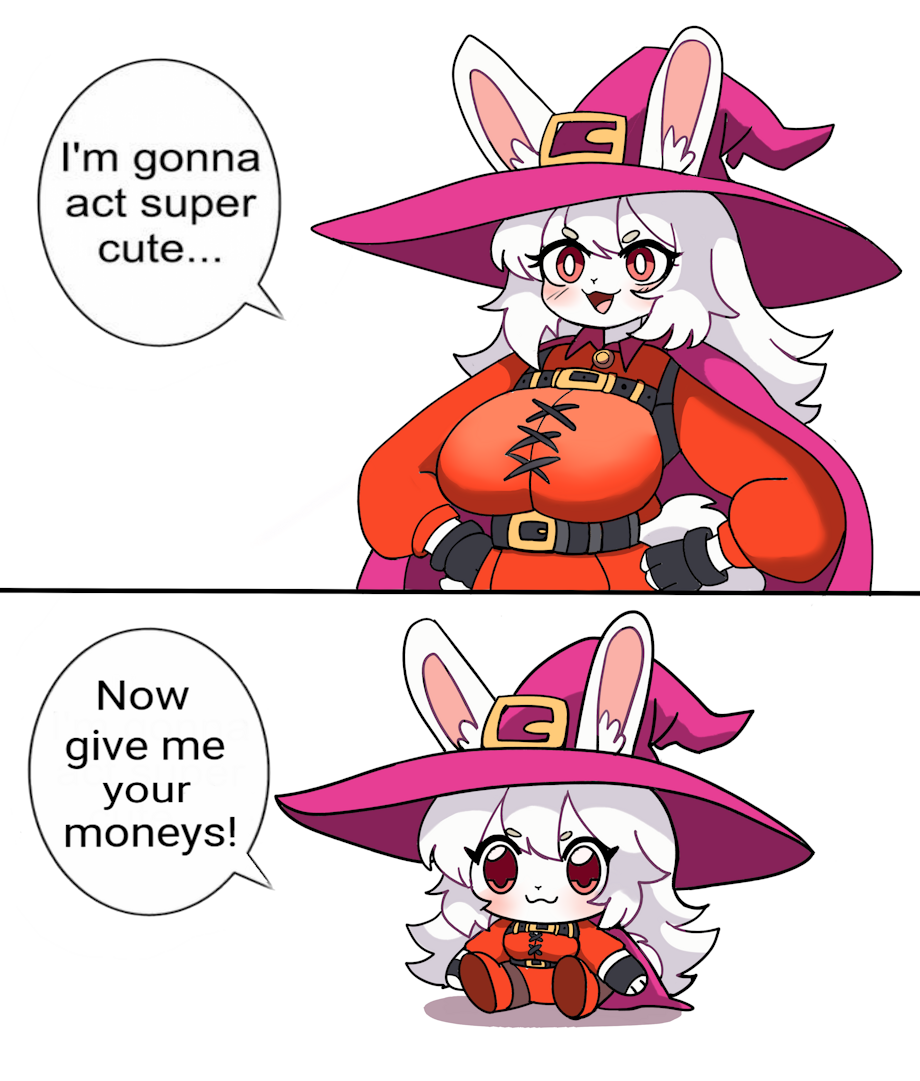 Beldora has learned a many of spells and tricks, one such spell is the ability to turn herself into a chibi. Look at her, she looks so cute don't you agree? Now give her your moneys!