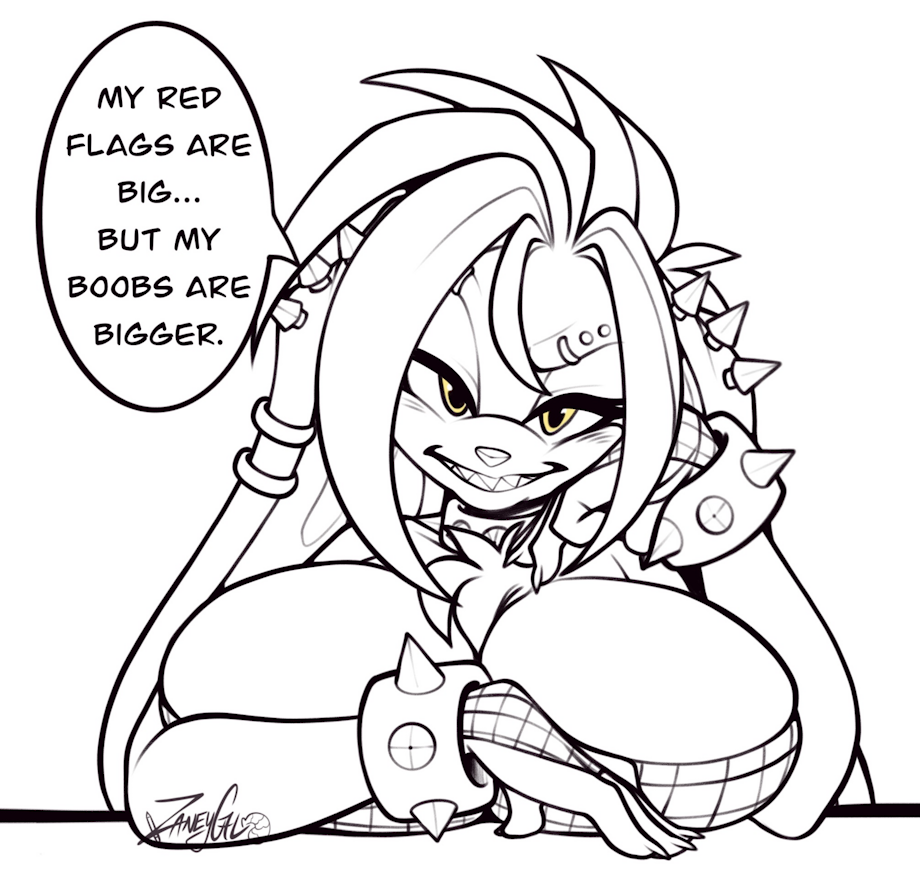 featuring my gothic punk bunny Remy. She’s got a warning label, but she’s not shy about what really stands out—“My red flags are big… but my boobs are bigger.”