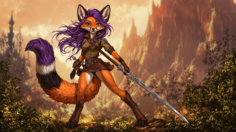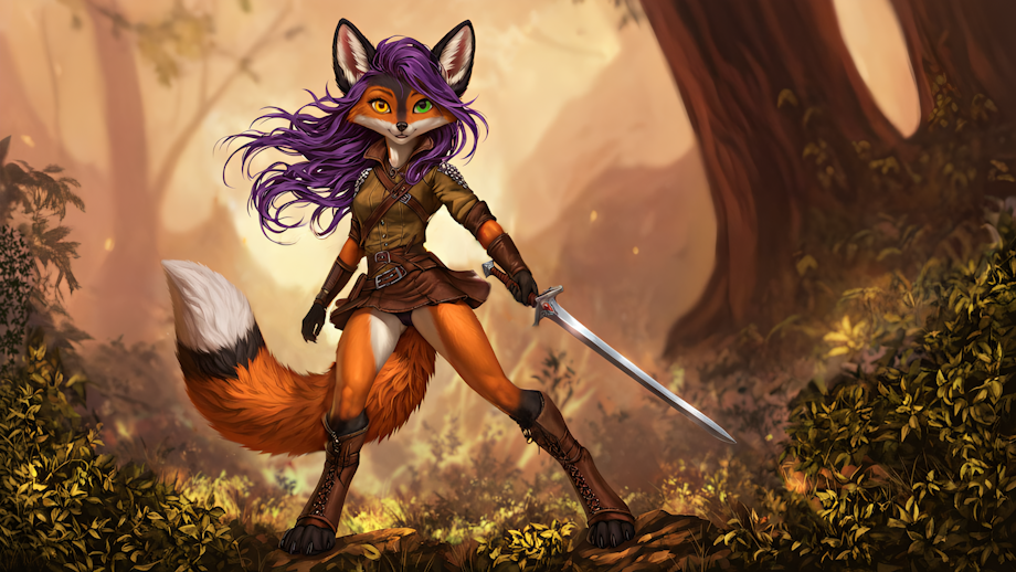 score_9, score_8_up, score_7_up, masterpiece, best quality, amazing quality, very aesthetic, high resolution, ultra-detailed, absurdres, newest, 8k, fantasy setting, Dungeons and Dragons scene, adventure scene, solo character, furry, anthro, fox, female, ((young girl)), pre-teen, cub, short orange fur, black ears, (purple hair:1.3), large oversized fox tail, long hair, black markings, digitigrade legs, slender body, lithe, BREAK, detailed hair, detailed fluffy fur, photorealistic details, detailed face, leather rogue clothing, fully clothed, short skirt, exposed thighs, mid-thigh high digitigrade boots, <lora:Age-V2:-1>