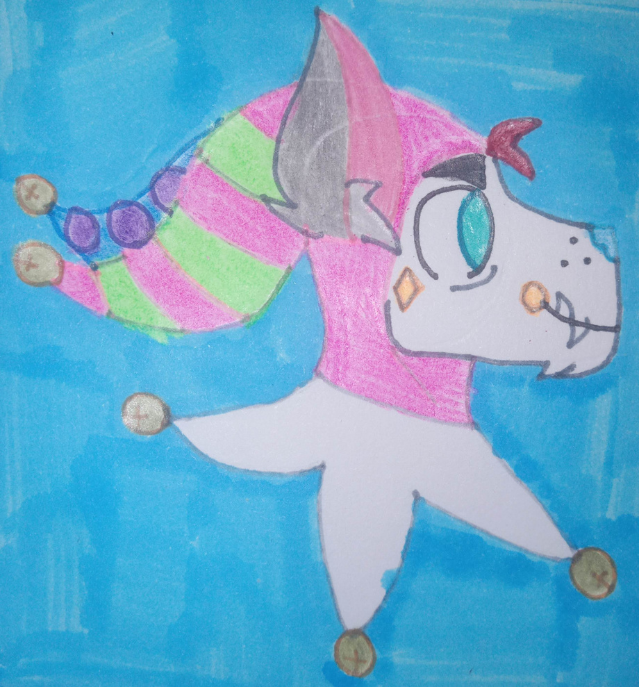 Ever since I drew my clown doggo pogo I wanted to make him a partner/ rival in the circus he's part of So here's he is pogos partner/rival Meet jangle the wolf jester he's a older member of the circus (around mid 30s) and originally from Russia and in his 20s he left home and joined the circus and when pogo joined they started out as rivals and later confessed their feelings for each other and became a couple (The classic rivals to lovers storyline) Name: jangle Age: 35 Species: wolf Birthday: April 16th Nationality:🇷🇺 Sign:Aries Occupation: circus jester Gender: male