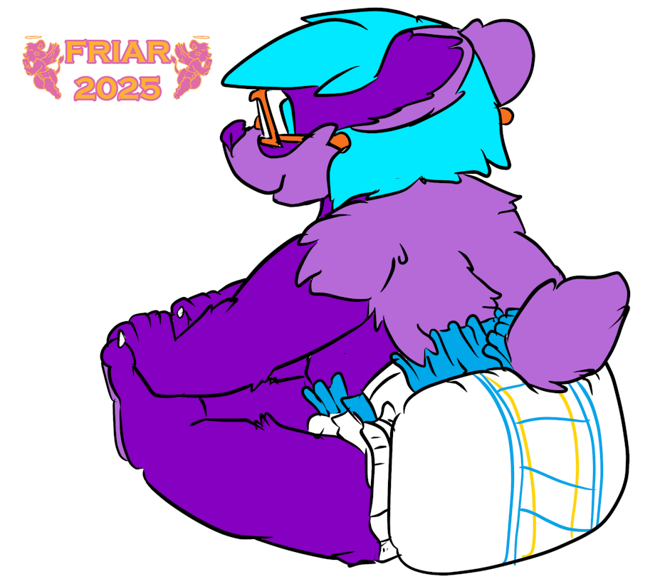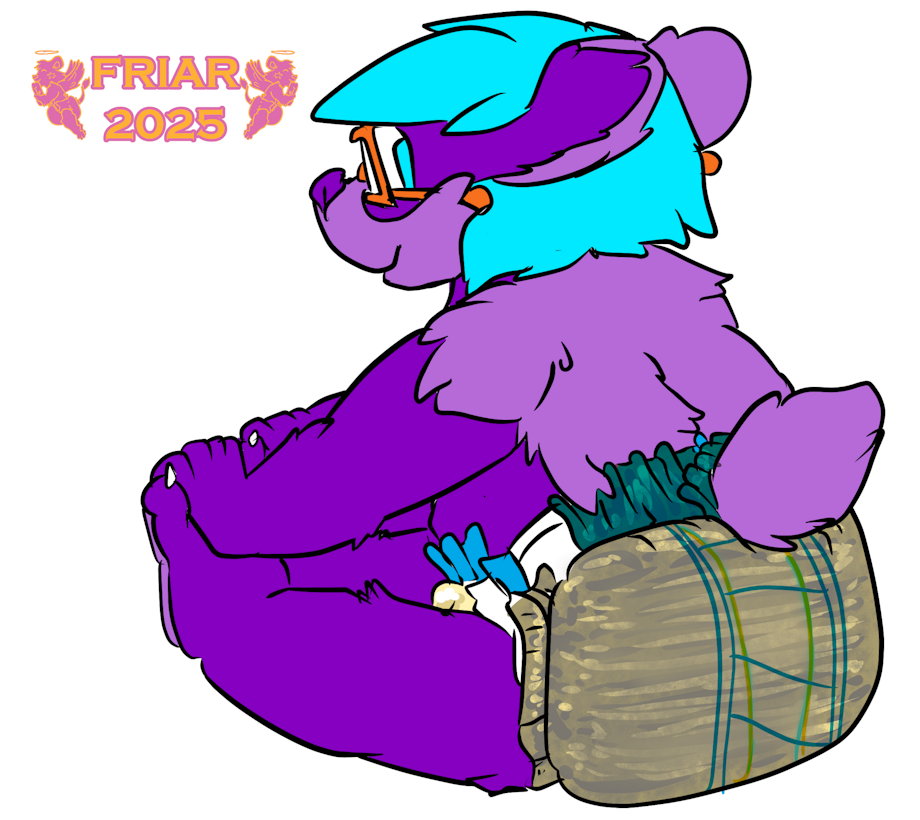 Illustration of Everett the wet and messy diapered badger touching his toes while seated on Toffee's bed as he looks behind at the viewer.
