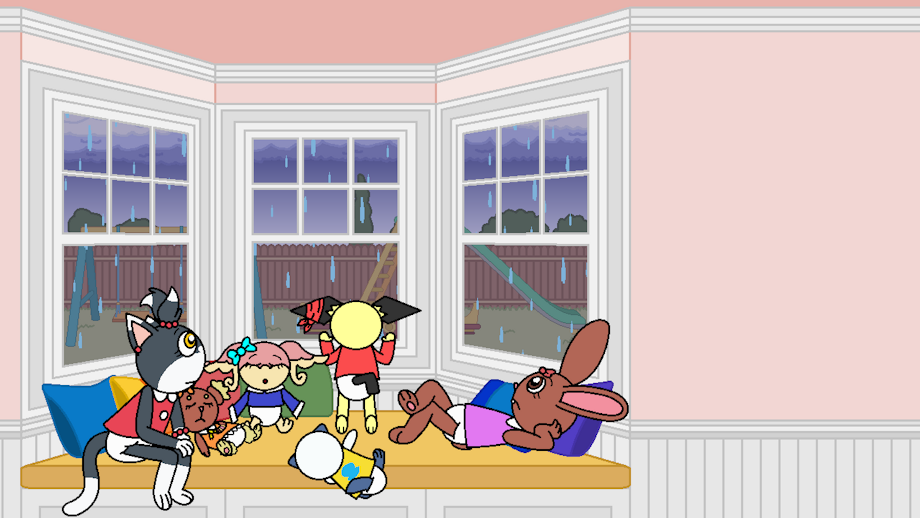 It's raining outside so Tiffany & her friends had to stay inside as they watch the rain from the alcove windoe seat while some took a nap.