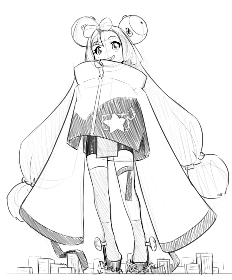 Hahah, simple but cute! Nice Ionogrin, she's proud of her stature! Her big floopy coat looks bigger than ever when it's drawn attention to like this, the sleeve straps flooping down onto the buildingtops and covering them is hilarious and a great showing of scale at the same time. Her platforms beat many of the buildings around, too! More literally than figuratively in two or three specific cases...