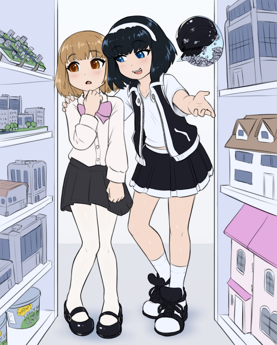 Ahahaha, tempting the tiny girl to feel big! Very good insert bubble, and the body language on both is great too! Chloe all nervous as she peers over at the shelves full of models while Rem eggs her on makes for an adorable sight. The models are drawn nicely too, with proper viewing perspective and multiple different designs to them. I like the varying scales and types of buildings! Also, the cameo in the bottom left, hahahah. Wow, I can't believe Rem has MULTIPLE of those stocked! Wait, yes I can.
