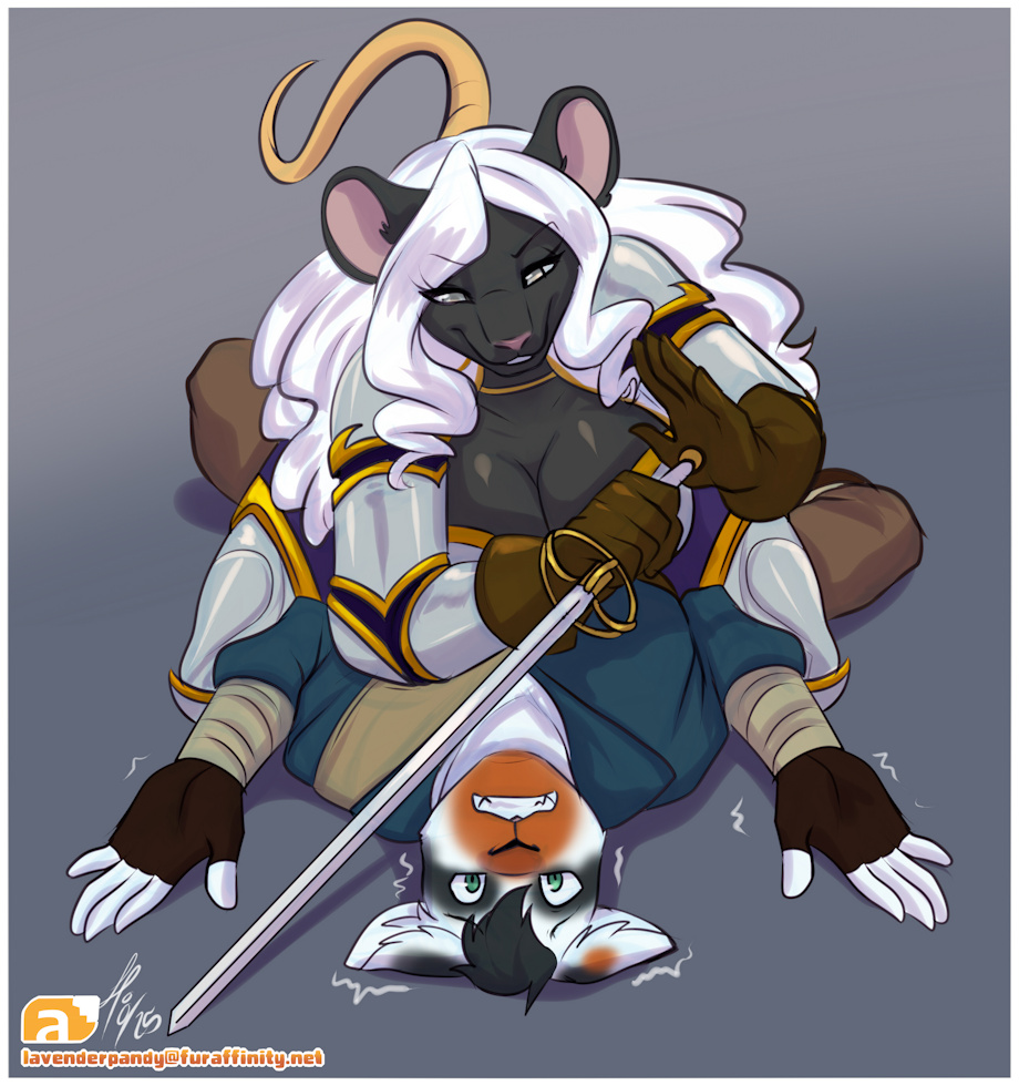 This is my mouse girl Faustine catching maverikat's OC representing himself. The pic is drawn by lavenderpandy.