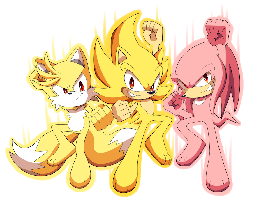 Sonic, Tails and Knuckles going super together as they're ready to save the world at all cost. Their power and spirit of teamwork make the boys even stronger despite not wearing their gloves, socks and shoes.