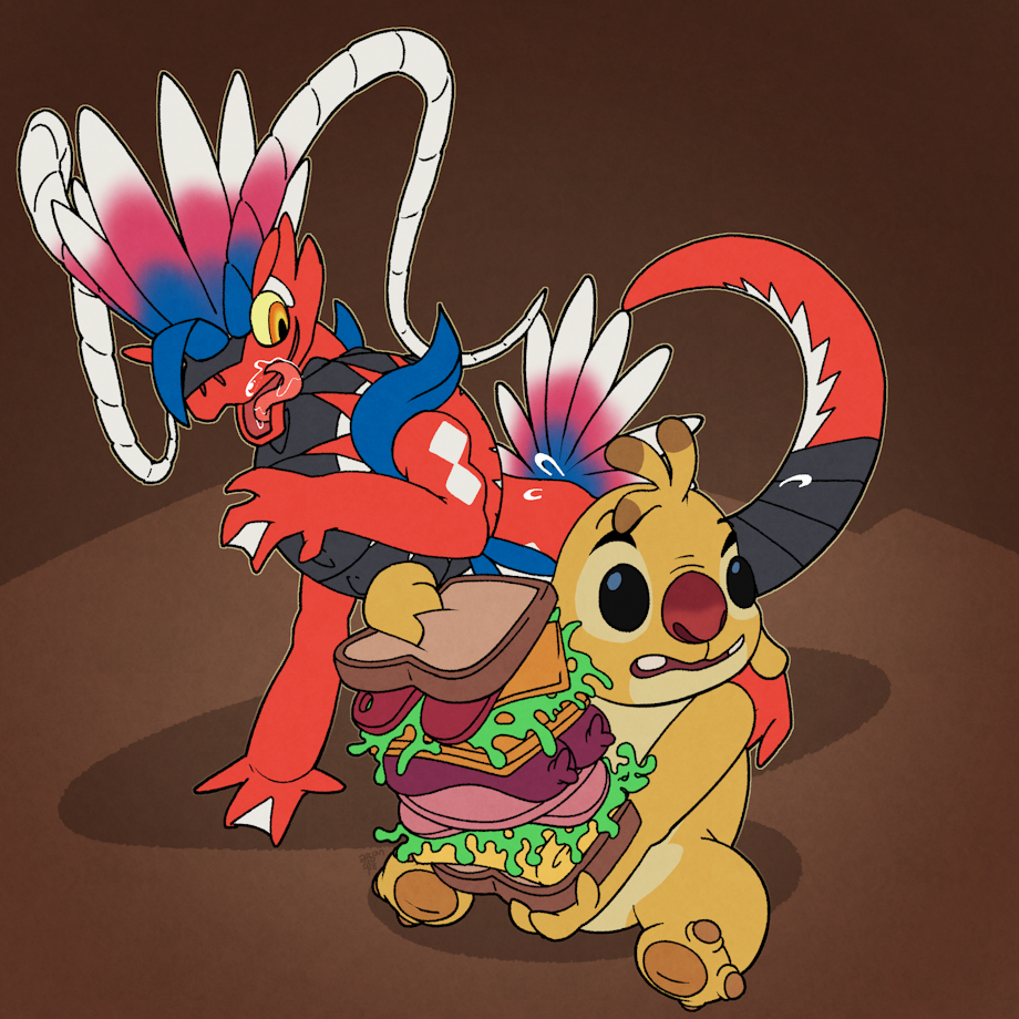 So I realized that both Pokémon Scarlet/Violet and the Lilo and Stitch series have characters obsessed with sandwiches so I got this piece of Reuben about to dig into a big sandwich though realizing that there’s something behind him, a rather hungry Koraidon whose also eyeing the sandwich.