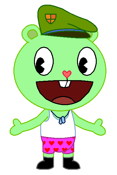 Here's something cute, adorable and funny I did. It's Flippy from HTF/Happy Tree Friends in underwear that males or females actually wear under their clothes. He is wearing Disco Bear's white sleeveless shirt/sleeveless top that is a tank top and tank shirt undershirt and A-shirt and vest and singlet from his workout and exercise and athletic and fitness and sports clothing/clothes in place of his best friend's white tank top from different Happy Tree Friends TV Series Episodes/Shorts along with Splendid's white undershorts and shorts and boxers underwear and underpants and undies with dark red and dark pink hearts on them from the episode: Gems the Breaks. Looks cute for a man bear to wear boxers and undershirt, doesn't it? And also, I forgot to tell you that the undershirt that he's wearing is from the episode: Ipso Fatso.