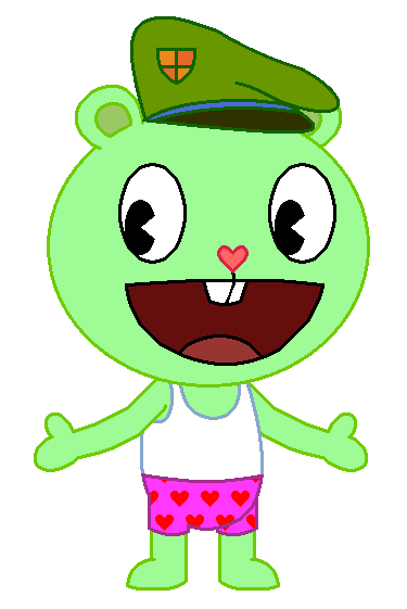 Here's something cute, adorable and funny I did. It's Flippy from HTF/Happy Tree Friends in underwear that males or females actually wear under their clothes. He is wearing Disco Bear's white sleeveless shirt/sleeveless top that is a tank top and tank shirt undershirt and A-shirt and vest and singlet from his workout and exercise and athletic and fitness and sports clothing/clothes in place of his best friend's white tank top from different Happy Tree Friends TV Series Episodes/Shorts along with Splendid's white undershorts and shorts and boxers underwear and underpants and undies with dark red and dark pink hearts on them from the episode: Gems the Breaks. Looks cute for a man bear to wear boxers and undershirt, doesn't it? And also, I forgot to tell you that the undershirt that he's wearing is from the episode: Ipso Fatso.